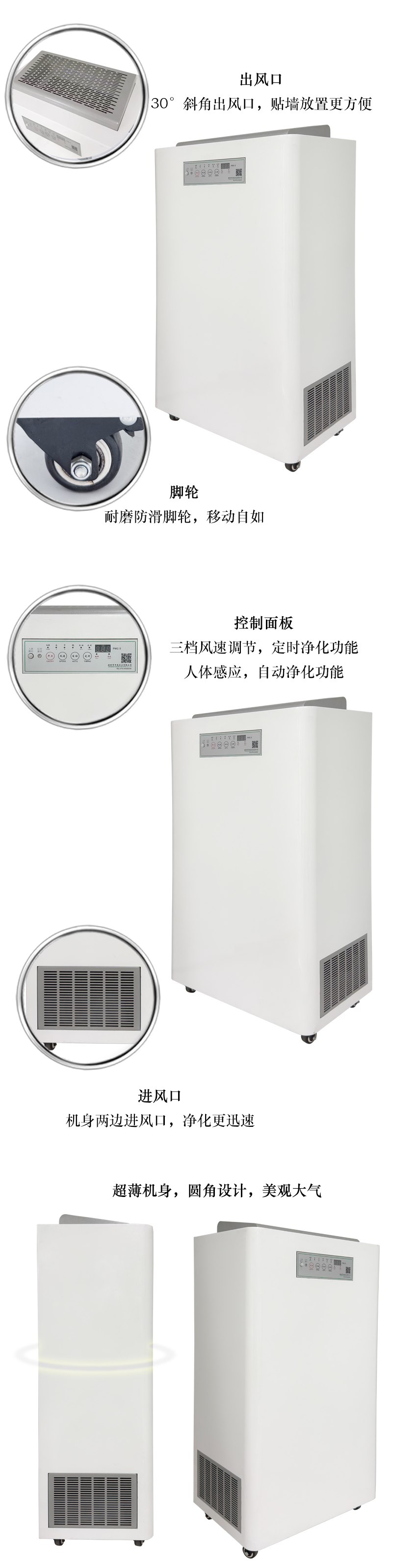 申瑞落地式空氣凈化機,內置高壓靜電場(電子集塵室)+層流過濾網+活性炭吸附+負氧離子功能,高效凈化清新室內空氣。